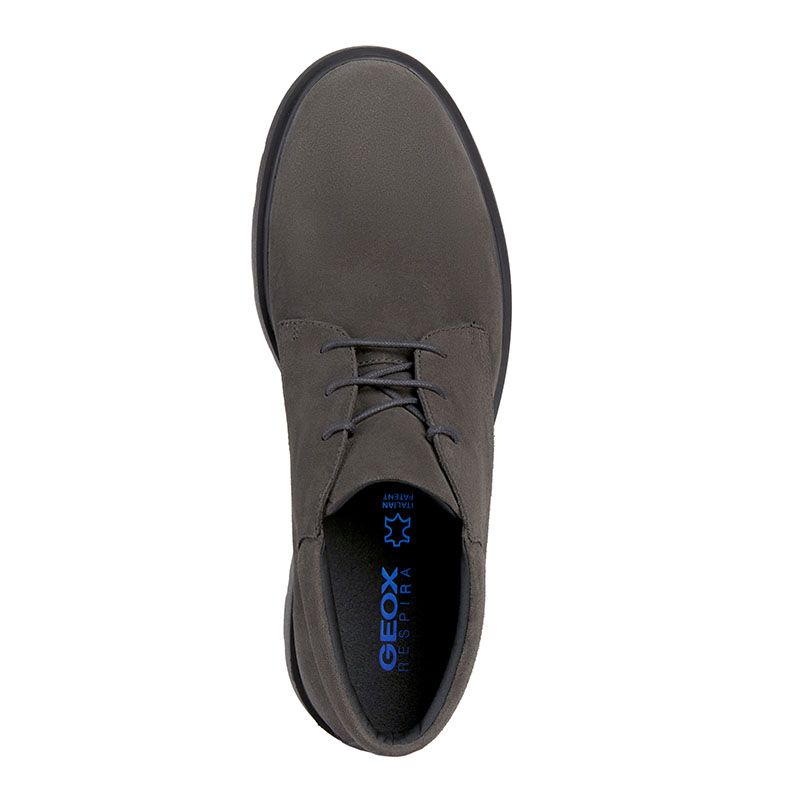 Ανδρικά μποτάκια της εταιρείας Geox σε γκρι χρώμα με κορδόνια. Κατασκευασμένα από δέρμα καστόρι εξαιρετικής ποιότητας. Τεχνολογία Respira, που επιτρέπει τη φυσική ρύθμιση θερμοκρασίας του ποδιού και έξτρα ελαφριά αντικραδασμική, αντιολισθητική σόλα από υλικά υψηλής ποιότητας. Πάχος σόλας 4 cm.