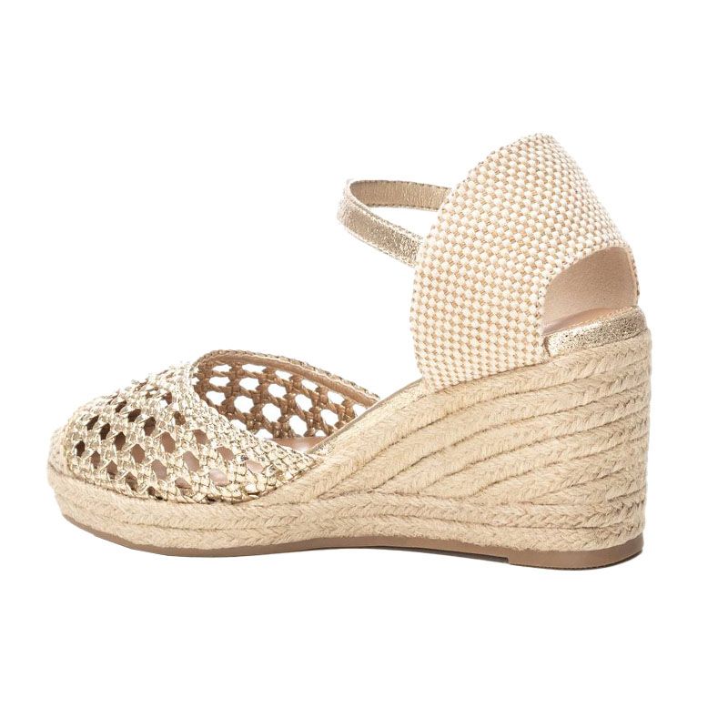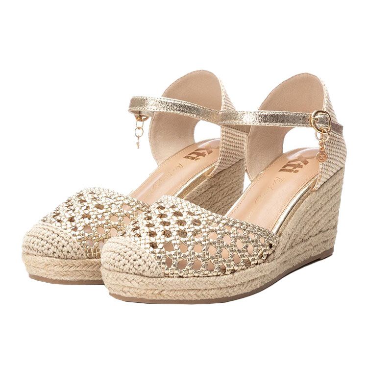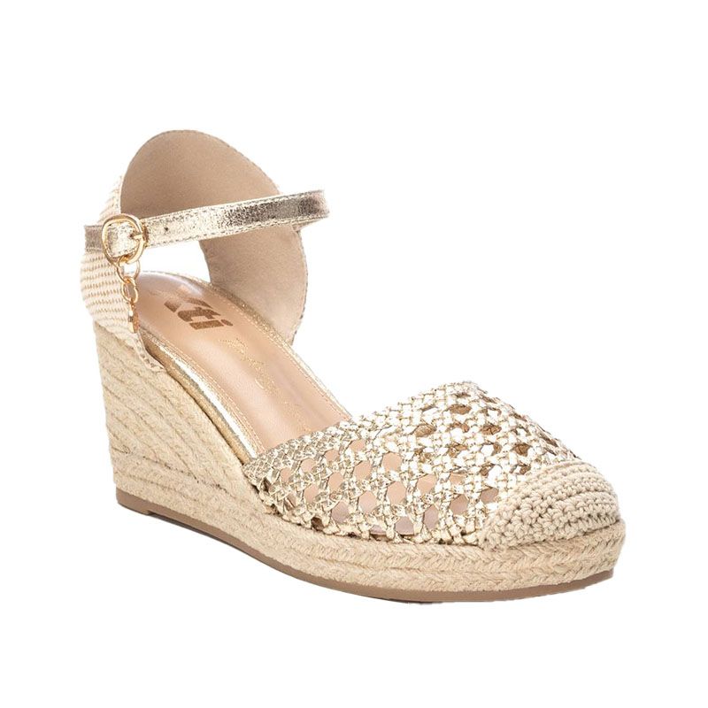 Μοντέρνες γυναικείες εσπαντρίγιες της εταιρείας Xti , σε χρυσό χρώμα από eco leather εξαιρετικής ποιότητας σε σχέδιο πλέξης, με μονοκόμματη σόλα ύψους 8cm καθώς και φιάπα 2cm. Διαθέτουν άνετο πάτημα με gel εσωτερικά και υπόσχονται να αναδείξουν κάθε σας εμφάνιση από το πρωί έως το βράδυ με επένδυση τακουνιού με σχοινί και δέσιμο στον αστράγαλο με λουράκι .