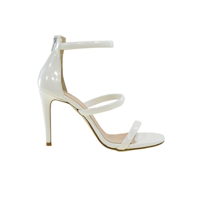 Γυναικεία πέδιλα MAKIS KOTRIS, σε λευκό χρώμα από λουστρίνι συνθετικό δέρμα,με τακούνι ύψους 10 cm ,ένα σχέδιο που θα σας βγάλει ασπροπρόσωπες σε όλες σας τις εμφανίσεις !! Δέρμα εσωτερικά.