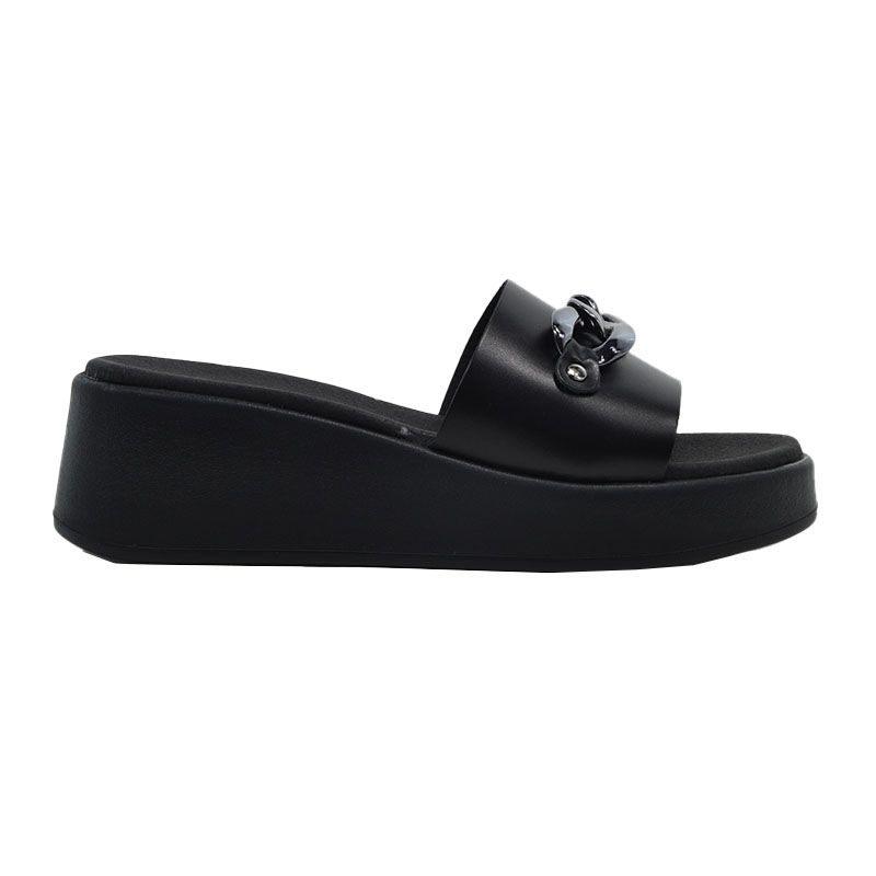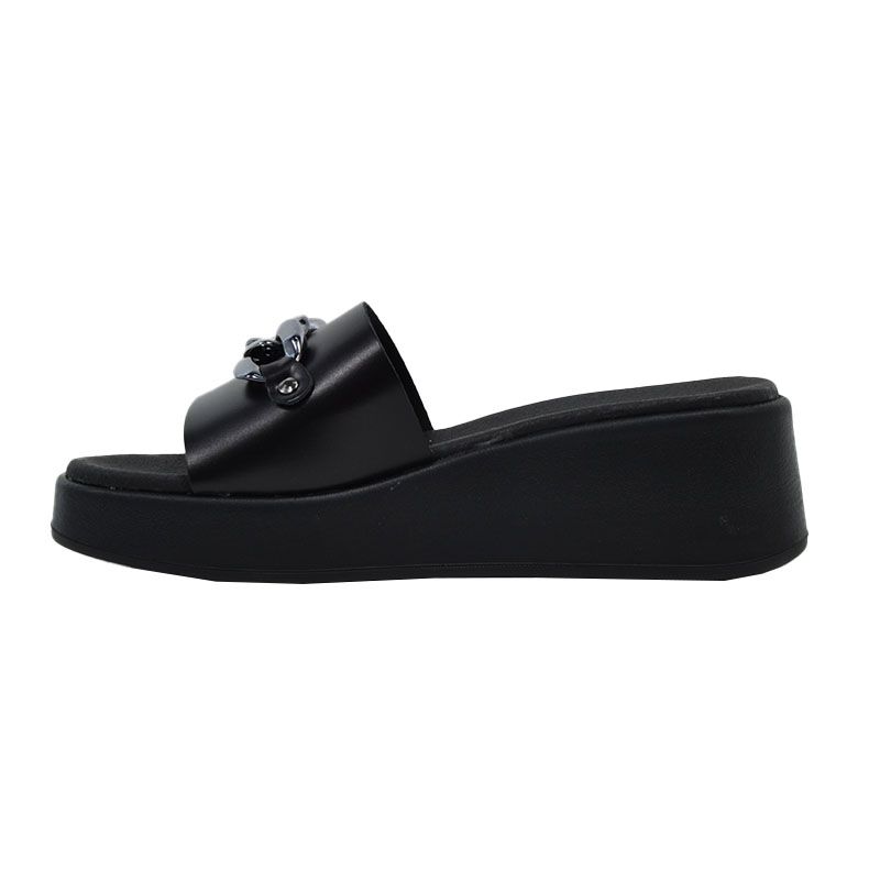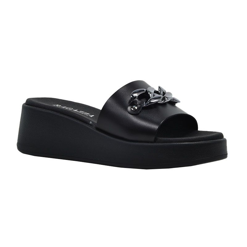 Γυναικείες παντόφλες Ragazza, με σόλα ύψους 6 cm, από φυσικό δέρμα σε μαύρο χρώμα για στυλάτες και άνετες εμφανίσεις. Επίσης, διαθέτουν τεχνολογία Dryflex στη σόλα που εξασφαλίζει μέγιστη απορροφητικότητα των κραδασμών χωρίς οσμές. Διαθέτουν ανατομικό πάτημα με αερόσολα στο εσωτερικό τους. Κατάλληλα ακόμα και για τα πιο κουρασμένα πόδια.