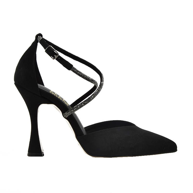 Γυναικεία μυτερή γόβα της εταιρείας Ellen, σε μαύρο χρώμα με κλειστή φτέρνα και χιαστή λουράκι με στρας στο κουντεπιέ. Διαθέτει καμπάνα τακούνι ύψους 10,5 cm και υπόσχεται άνεση σε κάθε σας βήμα. Κατασκευσμένες από eco suede εξαιρετικής ποιότητας.